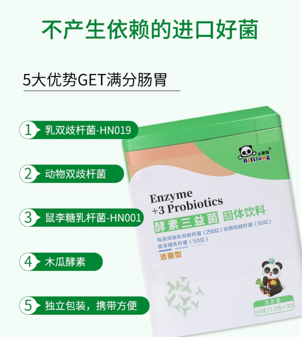 酵素三益菌,每袋添加350亿株活性益生菌 促进免疫,肠道双向调节,促进肠道活动。酵素三益特别添加了乳双歧杆菌、LGG鼠李糖乳杆菌、动物乳双歧杆菌三菌合-促进肠道活动、减少腹泻的发生,促进肠蠕动,调理便秘,帮助排便效果更好。